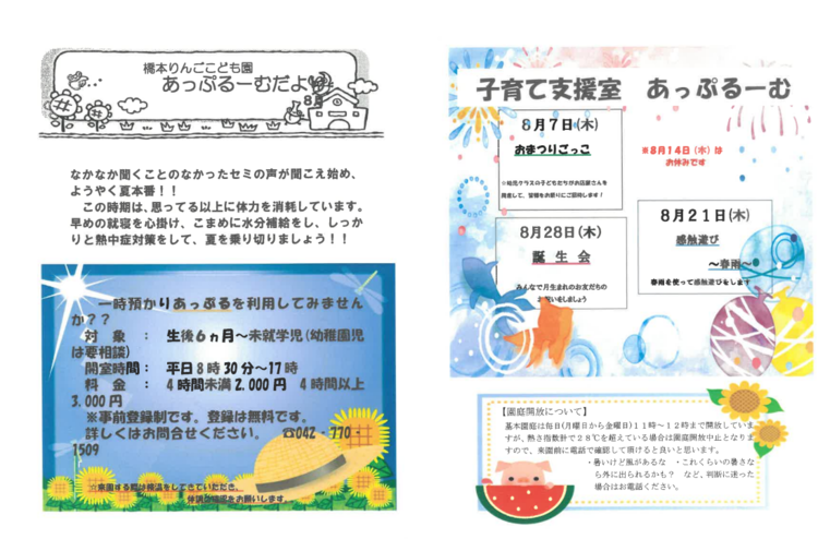橋本りんごこども園トップ > あっぷるーむからのお知らせ > 子育て支援室 8月のあっぷるーむ 子育て支援室 8月のあっぷるーむ 2025年08月01日更新 メニュー トップページ 各種お知らせ あっぷるーむ(子育て支援) こども園概要 1日の流れ・年間行事 施設紹介 アクセスマップ よくある質問 採用情報(外部リンク) 運営者情報 社会福祉法人 菊清会橋本りんごこども園 TEL:042-770-1509 FAX:042-770-1529 〒252-0143 神奈川県相模原市緑区橋本1-12-25 運営者情報はこちら